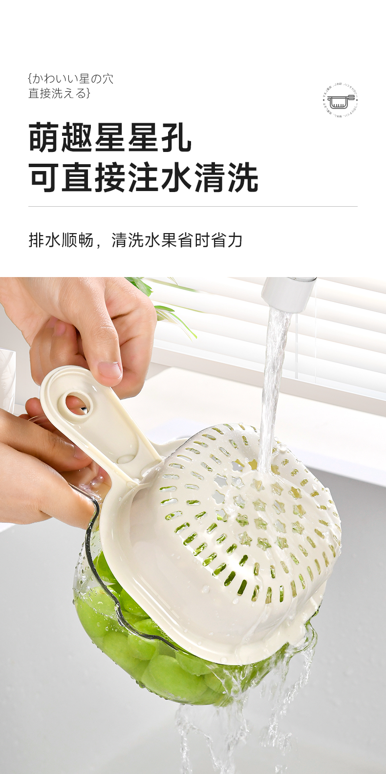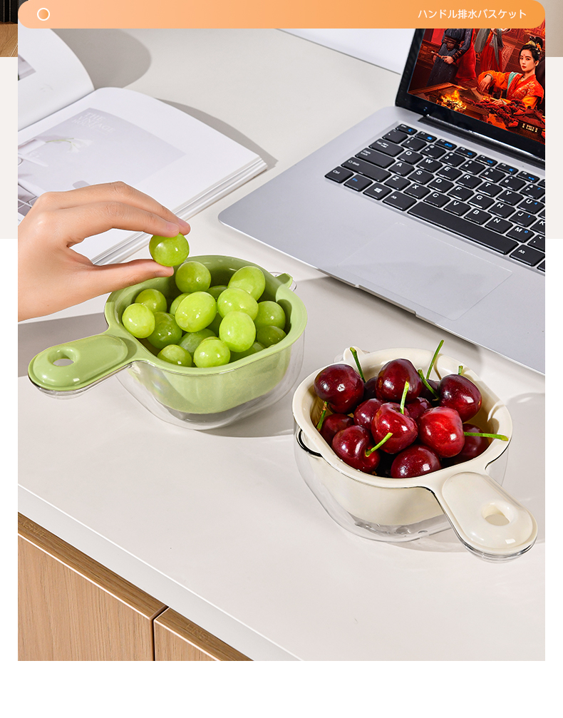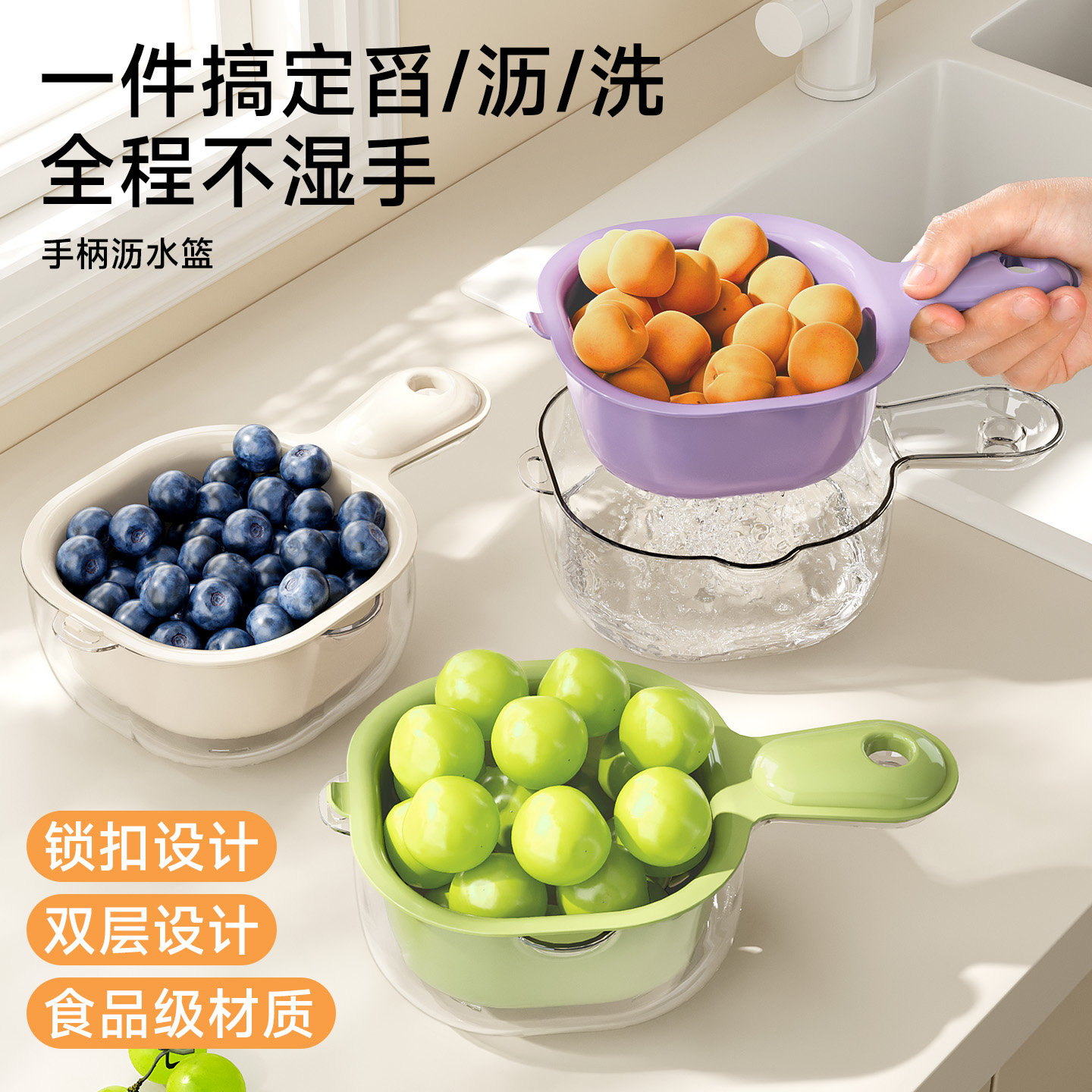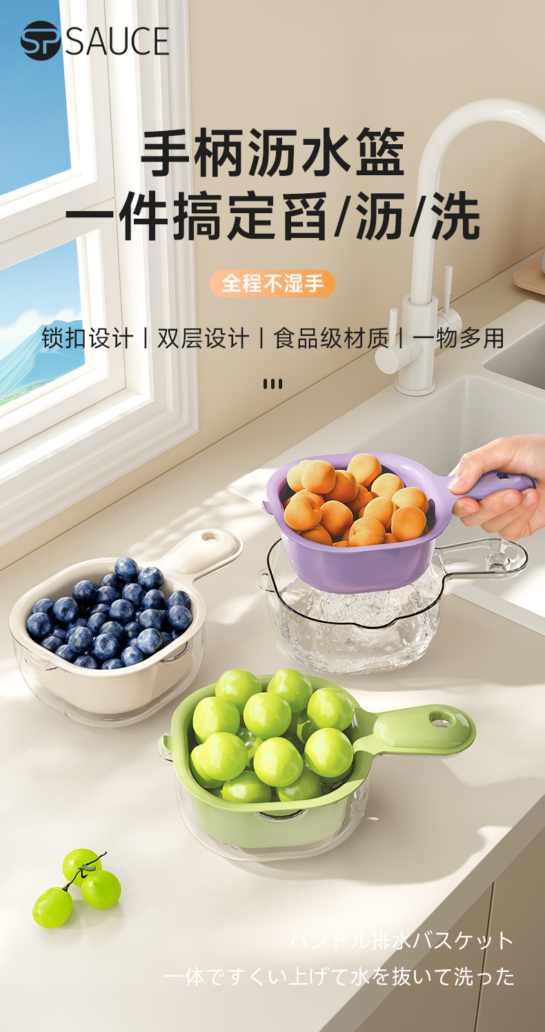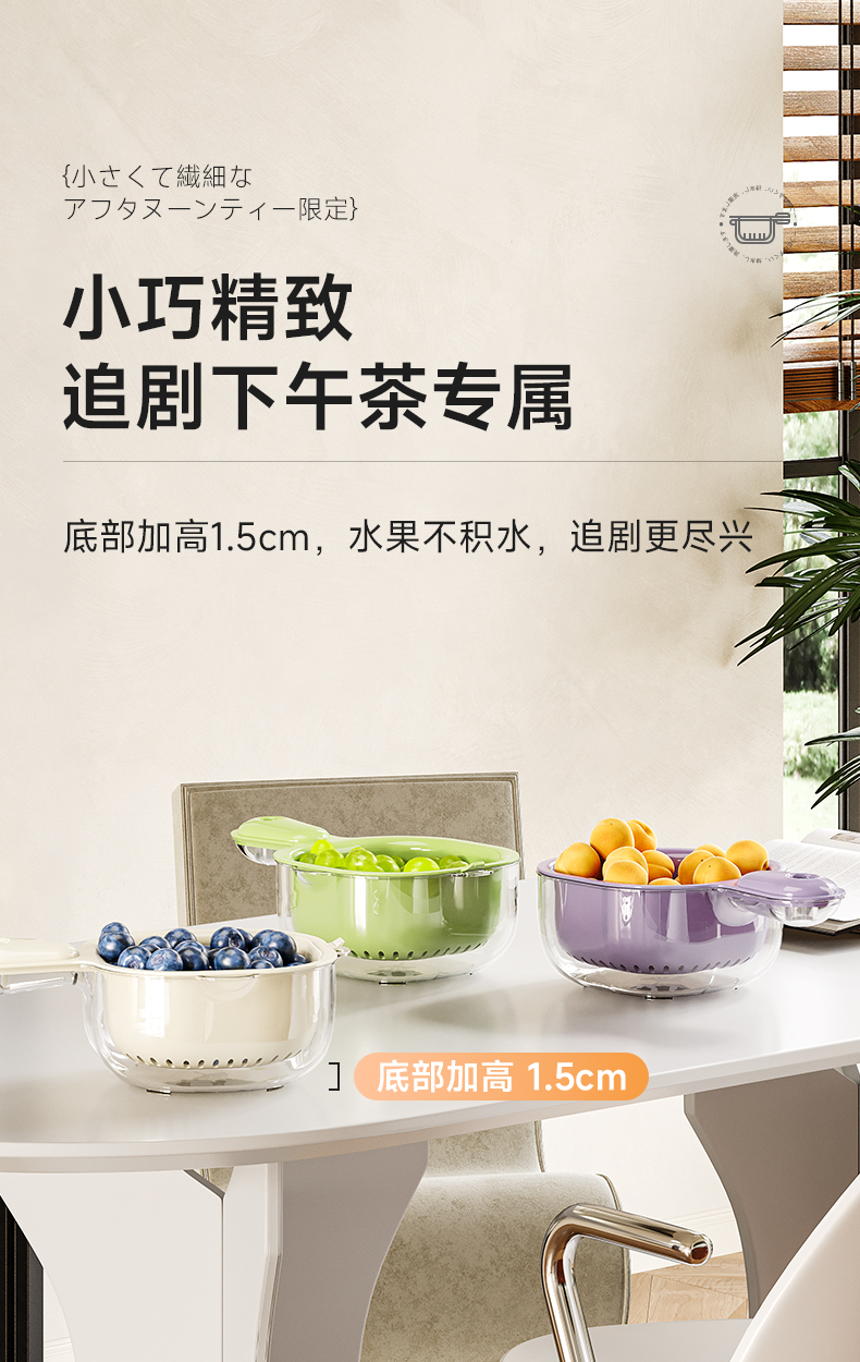 手柄沥水篮(软胶表情贴另拍) 双层洗水果神器沥水篮厨房家用新款客厅淋水篮精致小果盘