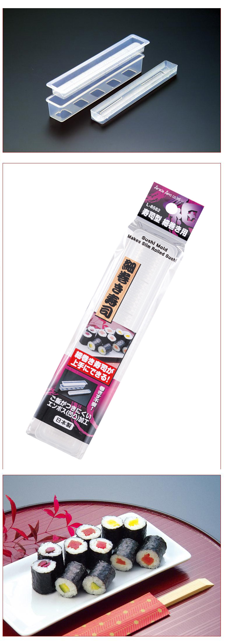 特 点: 产品特点: 1、本产品专门用于寿司的制作,简单实用,为您的生活增添美味与情趣。 2、接触饭团的部分经过特别的设计,使得成型的饭团可以轻易取出。 3、底盘镂空的设计,使您可以轻松推出帮助造型的部分,使用非常方便。 4、柱形底部有2块可活动的板,稍一按压就可把饭团取出,非常方便。 5、细长型的设计,可以做成细长寿司卷,也可以切成小段食用,随你所需。 卖家提醒:本产品的耐热温度为-20摄氏度到100摄氏度,使用时请注意 |