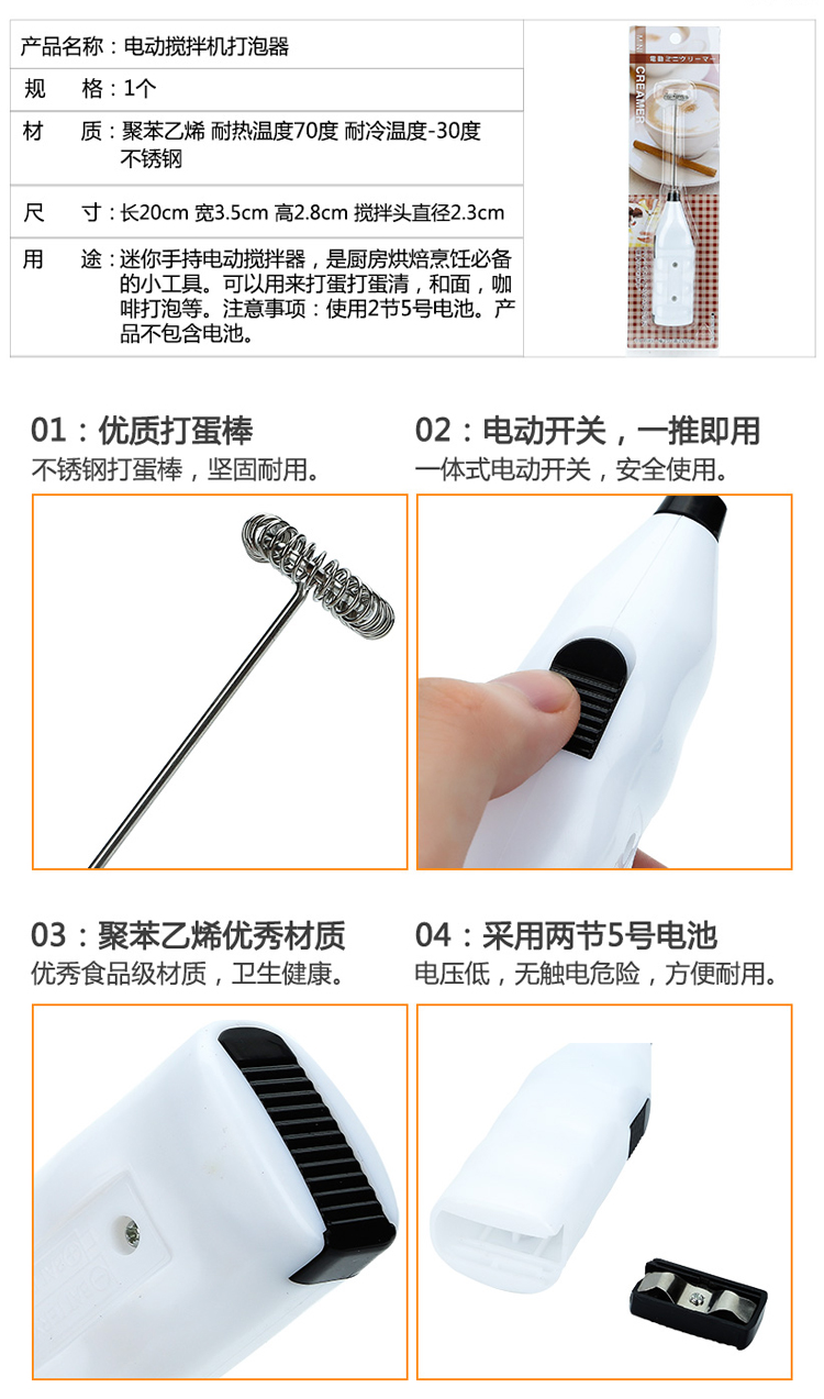 注意:此商品不适合用来打鸡蛋,奶油等做糕点用! 本搅拌器为电动,需要有两节“AA”碱性电池驱动。 输出电源:DC 3V 300毫安 电 池:两节AA1.5V电池(5号电池) 友情提示:本商品不含电池,电池请自备! |