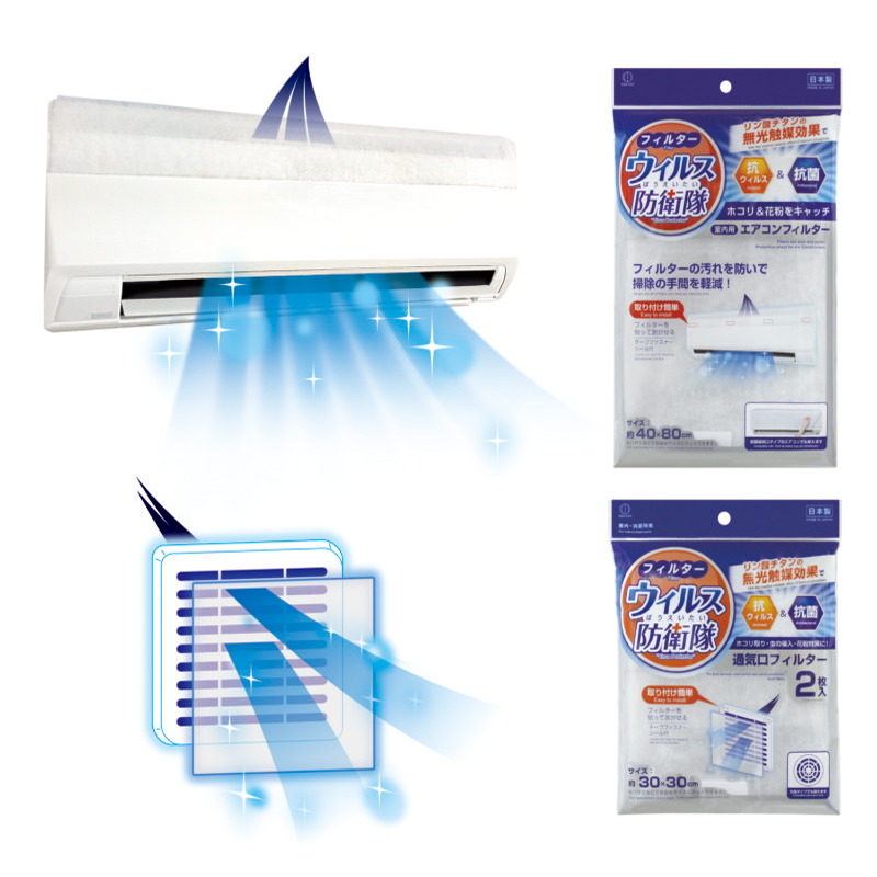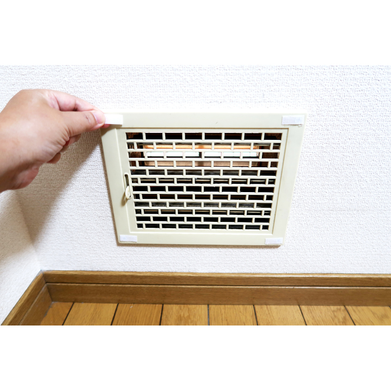 只要安装在房间的通风口罩上,就能捕捉花粉、灰尘、尘螨等。 通气口盖的间隙变得不容易脏,可以省去打扫的工夫。 通气口的形状是角型类型,圆形类型也能使用。 磷酸钛的无光触媒效果抗病毒※、抗菌※。 使用通气性好的无纺布。不易妨碍空气流通。 附有胶带贴纸。安装·取下简单。 过滤器可以用剪刀等剪成自由的尺寸。 如果滤网的污垢明显的话请尽快更换。(更换的标准是3 ~ 6个月) |