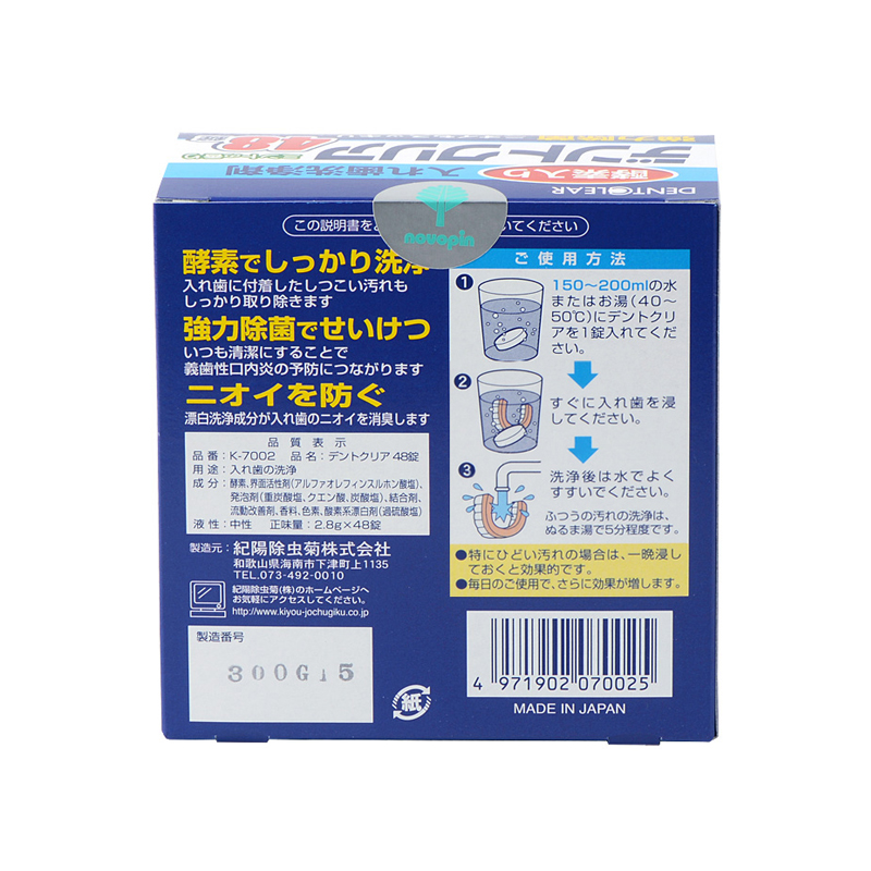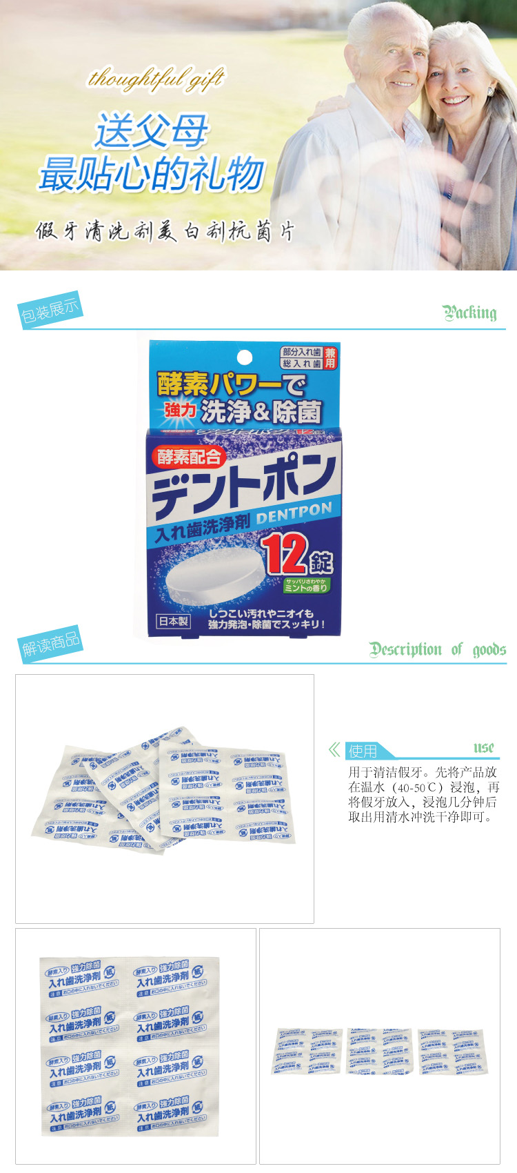 【产商】日本纪阳除虫菊株式会社 【产地】日本 【保质期】三年 【成分】酵素、界面活性剂、发泡剂、结合剂、流动改善剂、酸素系漂白剂等 【规格】48锭入 【标准适用量】150~200ml 【用途】 清除假牙上的牙垢、细菌、消臭并美白牙齿,48枚超值装,更经济实惠哦~ 【使用方法】 1、先将1锭清洗剂放入水温在40~50度、150~200ml的水中 2、将假牙浸入水中 3、最后在流动的水下冲洗干净即可 ![]() |
