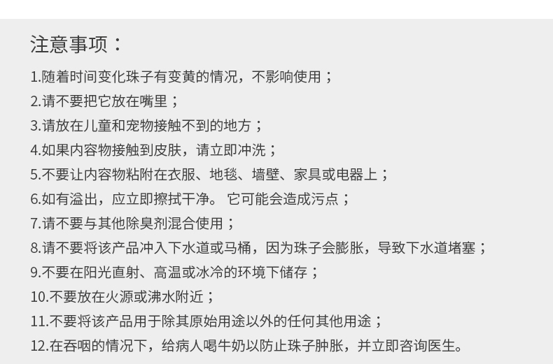 产品材质瓶身:PET,盖子:PP,铝封口,除臭珠(水、吸水树脂、表面活性剂、除臭剂、防腐剂、紫外线吸收剂、香精)
