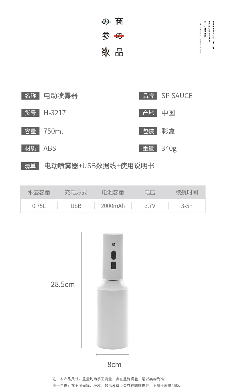 D 电动消毒喷雾器 750ml 多功能电动喷雾器浇花喷壶家用消毒酒精喷雾瓶小型高压喷水壶浇花神器