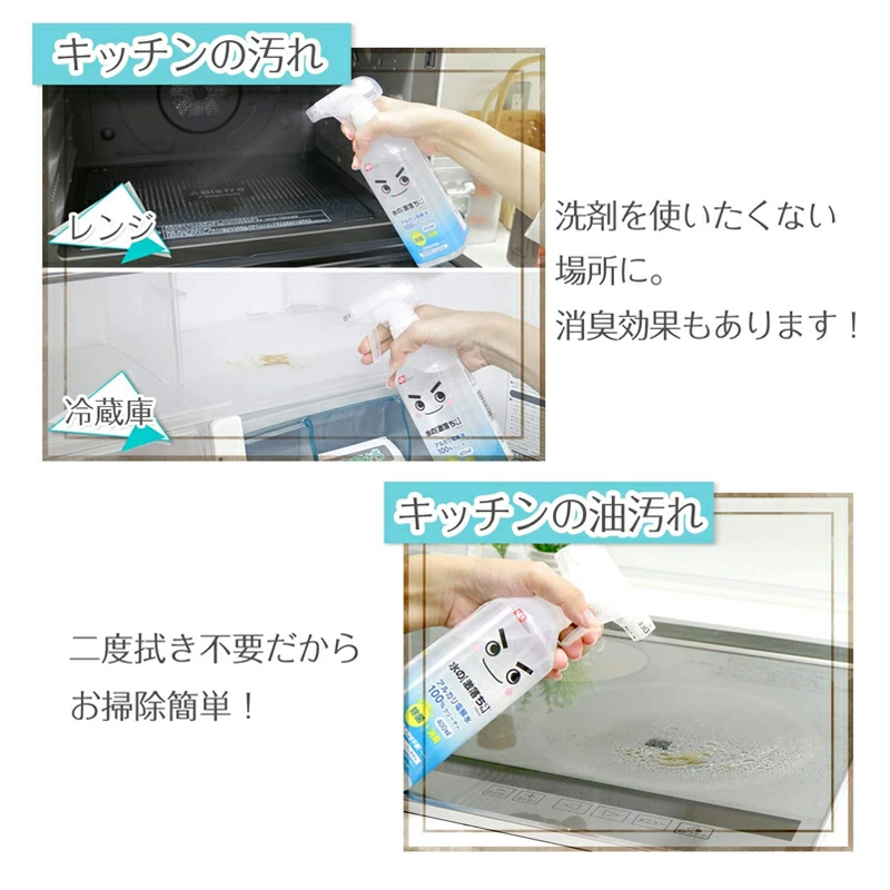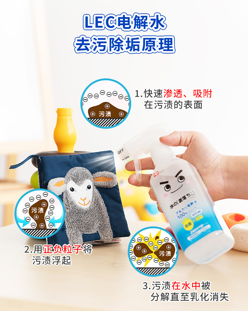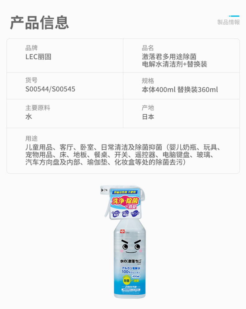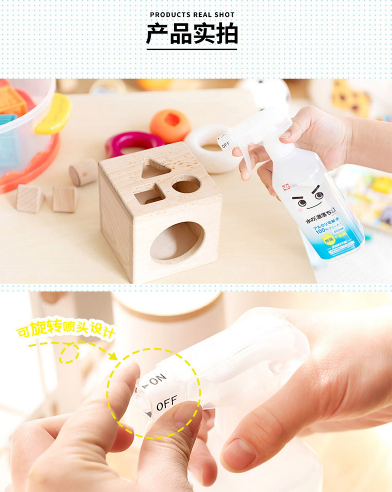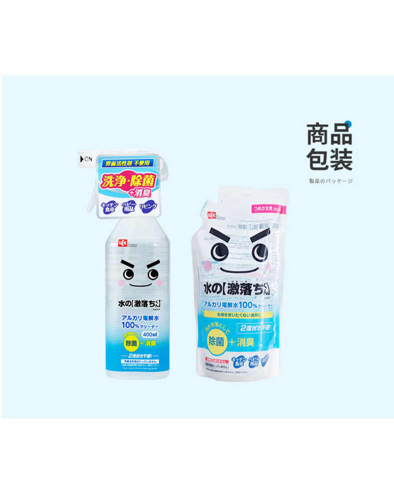 请零售商注意,此款商品限价销售,最低限价如下: 日常最低零售价:59.00 元 最低小促价(活动):54.00 元 小促适用:聚划算、年会节、三八女王节、55吾折天盛典、88会员、99大促、其他平台级活动 最低大促价(活动):49.00 元 大促适用:618年中大促、双11大促、双12大促 【商品详情】 是100%的碱电解水清洁剂,无色无味。 碱离子(负离子)包裹着擦不掉的污垢,使其浮起来。 厨房的油污、客厅的污垢等,整个家里都能用这款清洁剂来打扫。 因为可以去除污垢和杂菌,也有除菌·消臭的效果。 【使用方法】 将喷口打开,直接喷完后(使用量标准:每平方米喷6次),请擦掉或冲洗干净。或者,请用抹布等擦拭。之后不需要擦两次。使用后请务必将喷口关闭保存。 ※因为根据材质、涂装的种类有变色的情况,请在不显眼的部分尝试后使用。 ※特别是“宽出”的喷射口的情况下,请充分注意液体向周边的飞散。 ※不能用电解水擦拭的东西:漆器、皮革类、丝绸制品、铝、铜、黄铜、贵金属、宝石类、金箔、清漆家具、眼镜、汽车漆面等。