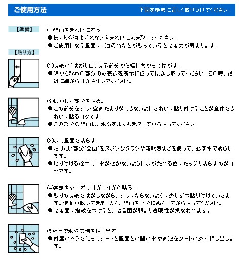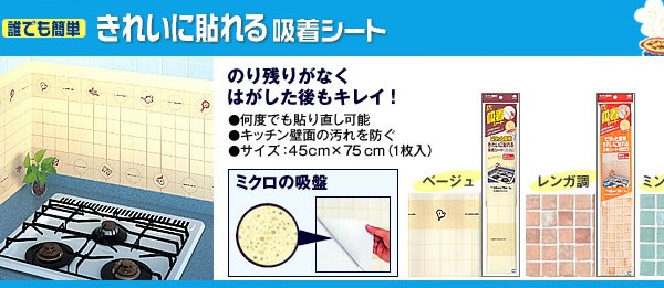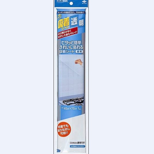 吸盘式墙贴 尺寸:45*75CM 材质:吸附加工聚酯薄膜 产地:日本 使用目的:此商品可保护厨房墙面不受油污污染。 商品特点:产品使用特殊材质制成,不含粘着剂成分,可反复贴附使用,而且不会在墙面上留下残留物。 使用方法