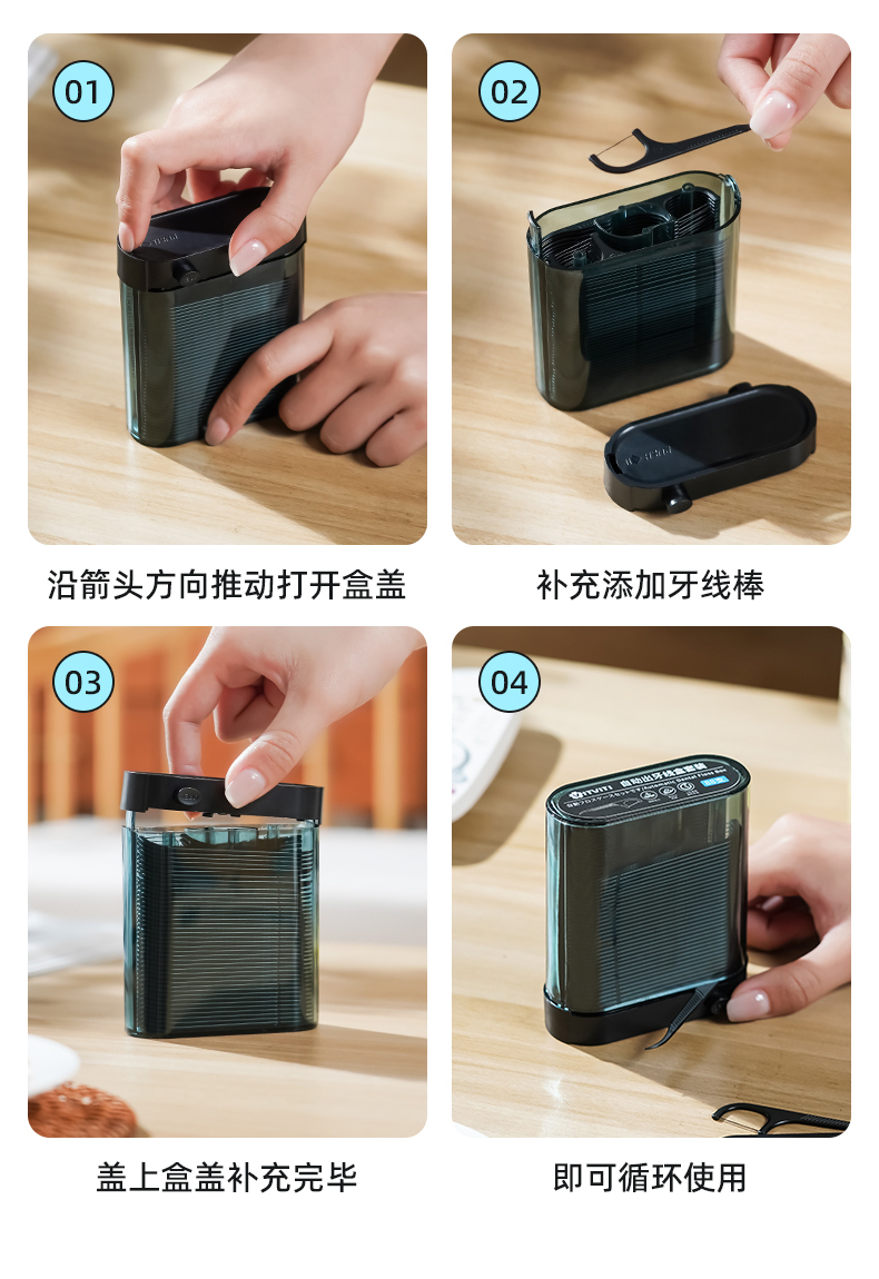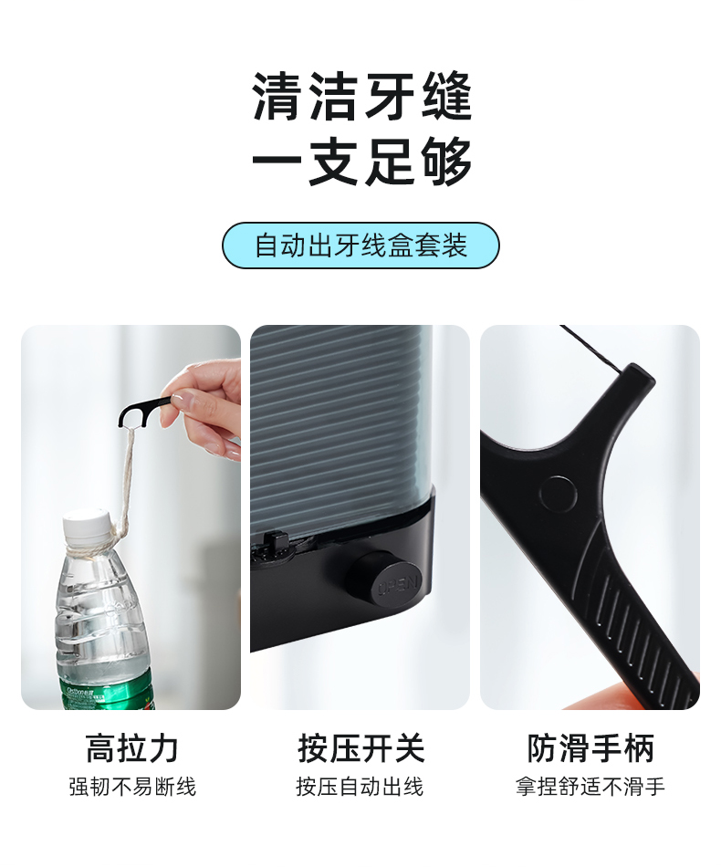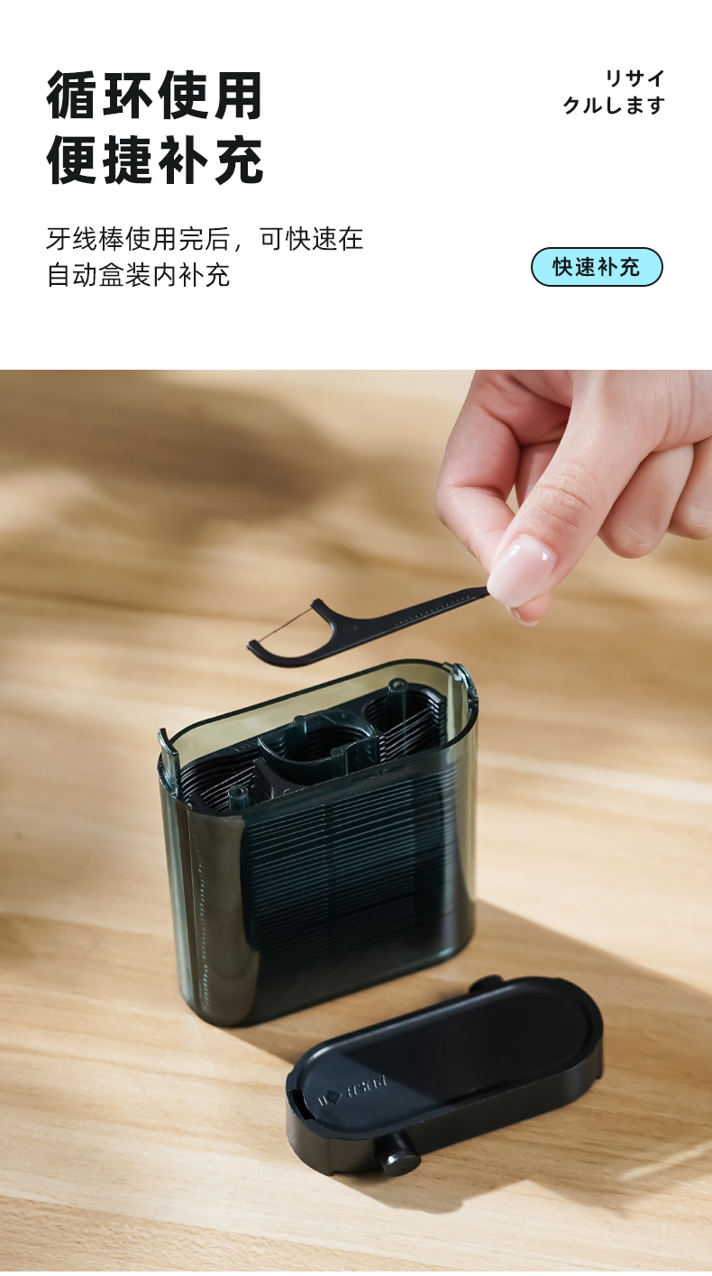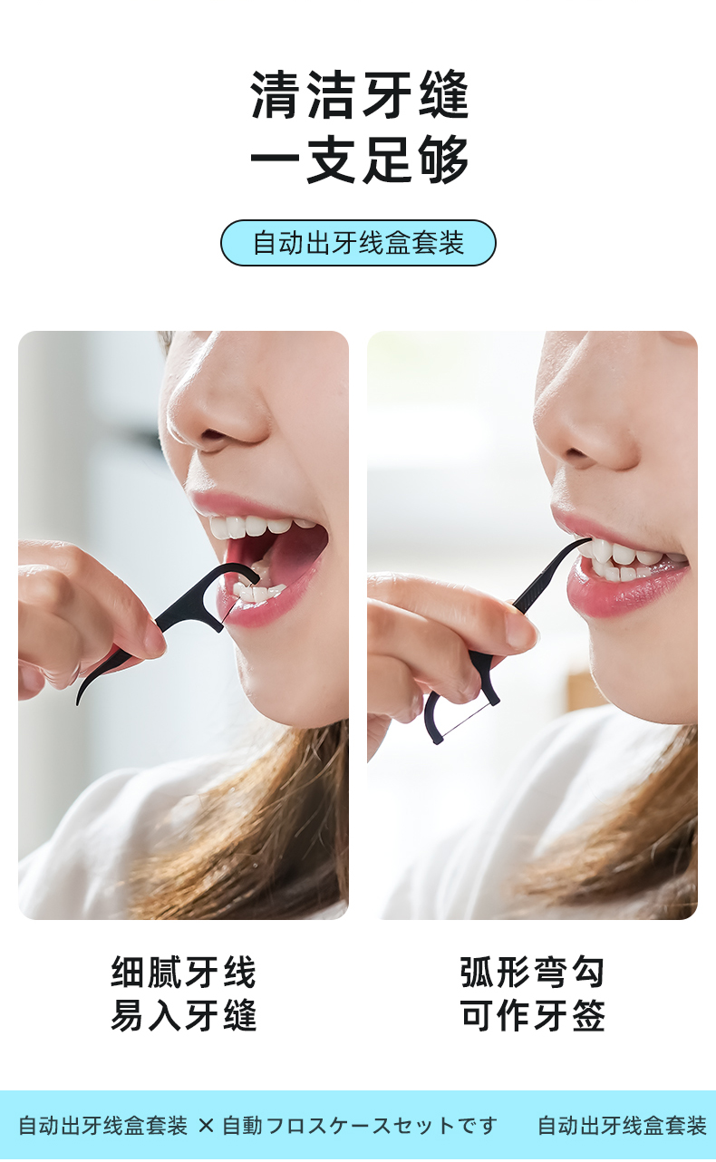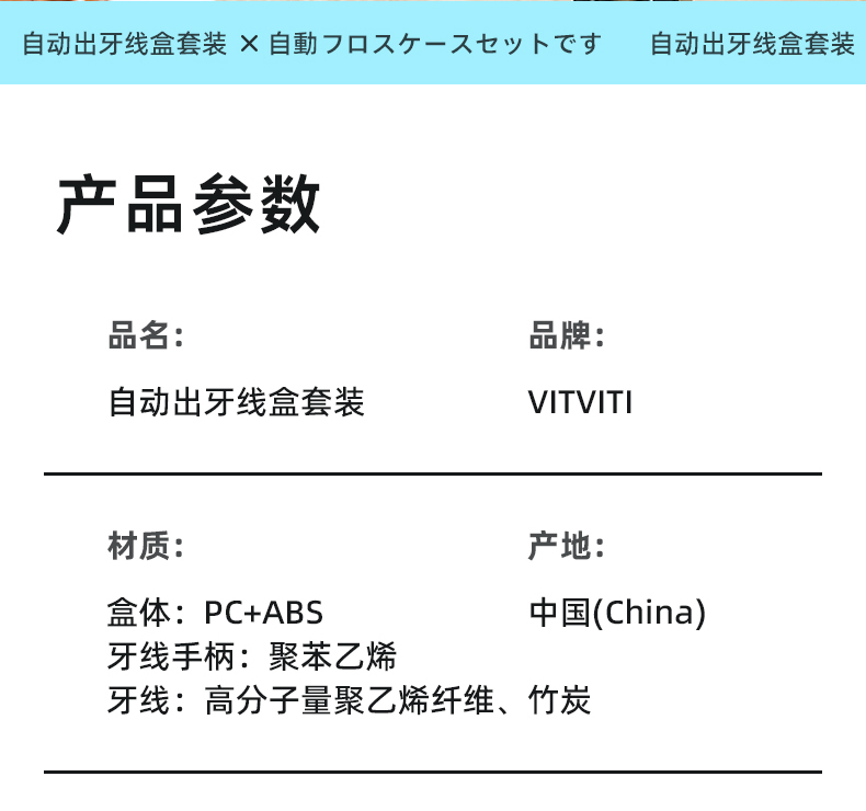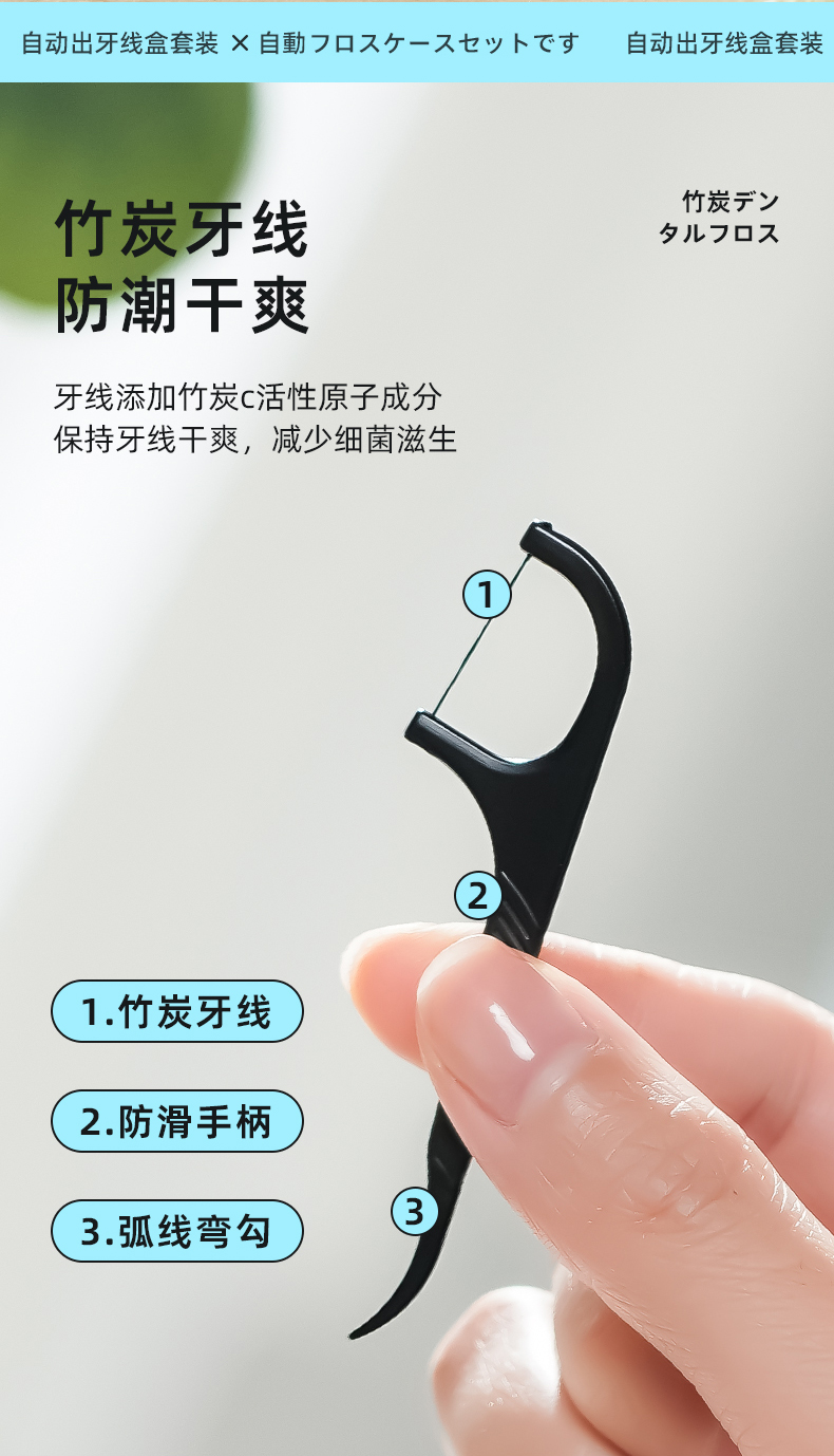 产品材质盒体:PC+ABS、牙线手柄:聚苯乙烯、牙线:高分子两聚乙烯纤维,竹炭