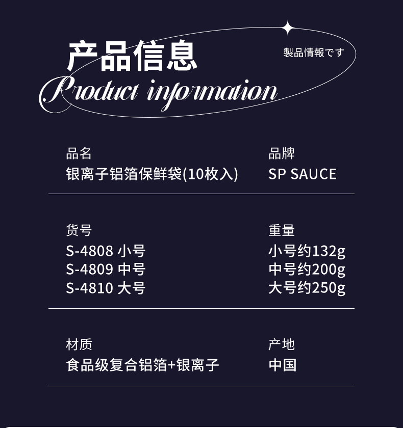 产品材质食品级复合铝箔+银离子