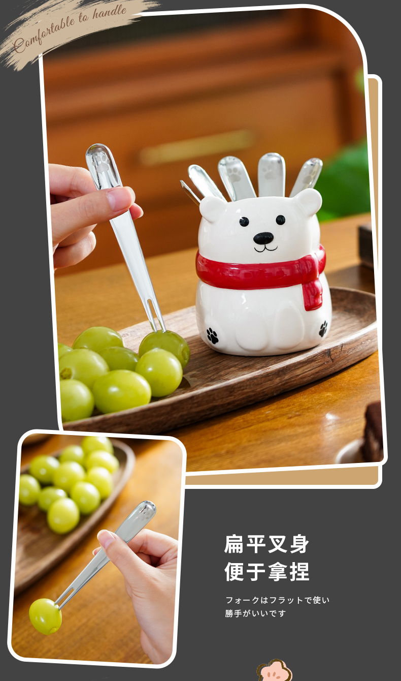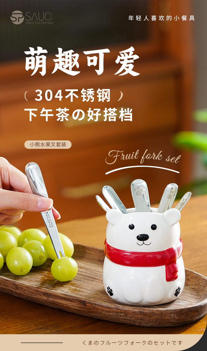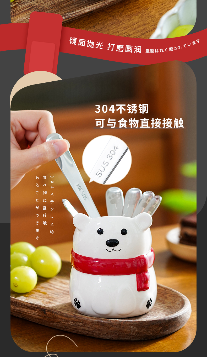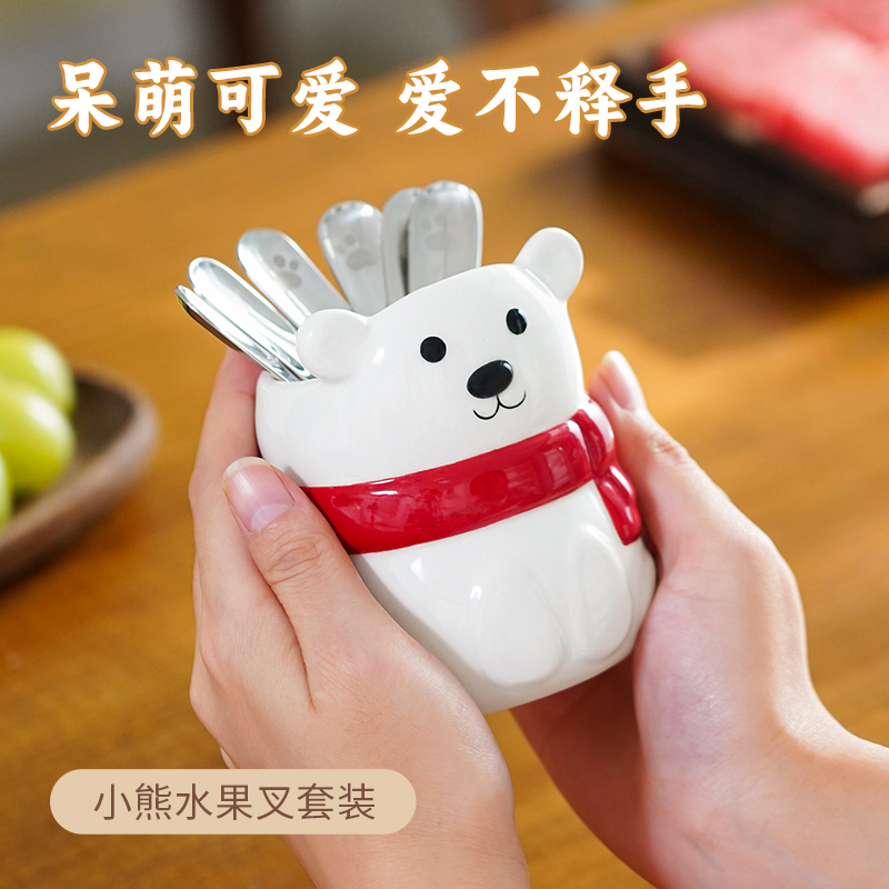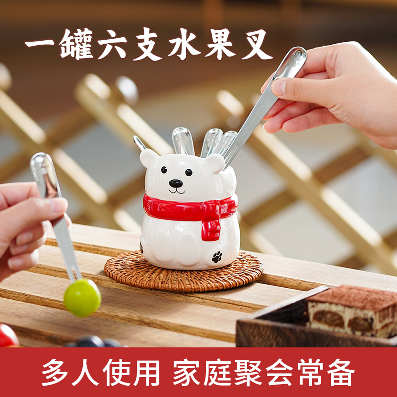 304小熊水果叉套装(6支装) 304水果叉子套装甜品糕点下午茶勺子聚会聚餐水果签小熊陶瓷罐子