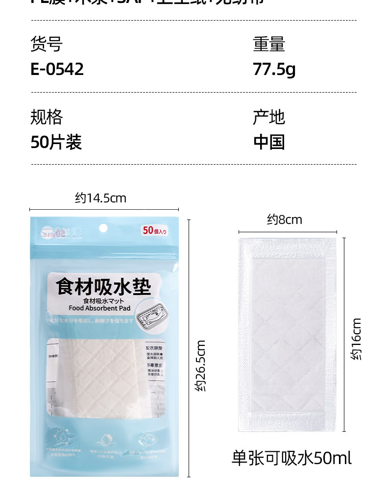 食材吸水垫(50片装) 食材吸水干燥垫鱼虾肉类干燥吸水片水果冷鲜冰镇袋