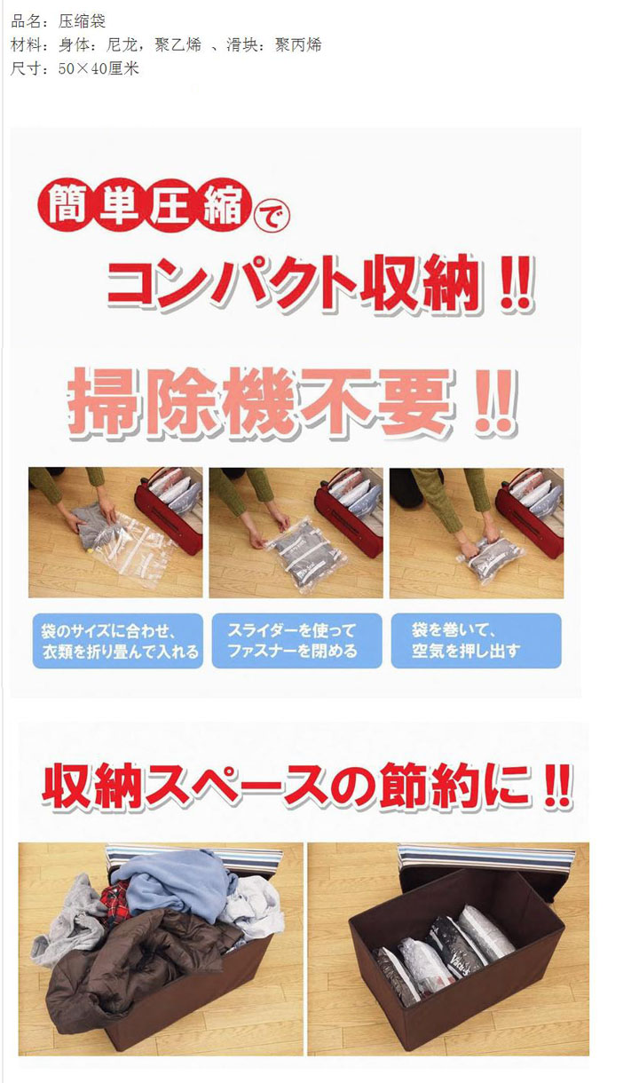 品名:手压式真空压缩袋 又称:坐压式或手卷式压缩袋(屁股压下,小手卷卷就能排气,绝不漏气) 产地:日本制造 特点: