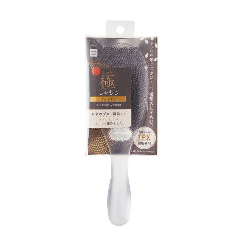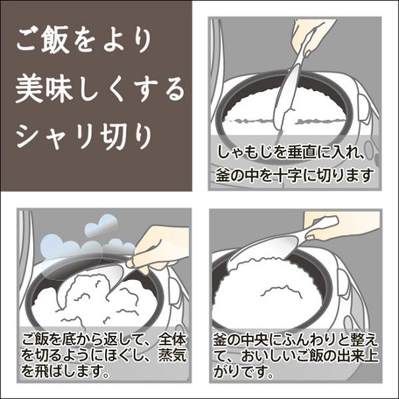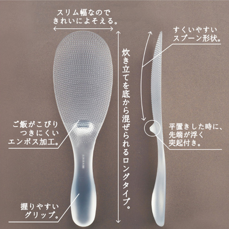 ●使用剥离性高的TPX树脂 因为使用了仅次于氟树脂的剥离性高的TPX树脂,所以不容易粘米。 从底部搅拌刚煮好的东西的尺寸和容易盛饭的勺子形状。因为夹层很薄,所以不会压碎米饭,特殊的压花加工使米饭不容易粘在一起。平放的时候前端有突起,使用卫生。因为没有接缝容易清洗。 |